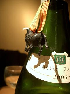 この牛、スペインはカタルーニャ地方の赤ワイン、“Torres Sangre de Toro トーレス サングレ デ トロ”というワインにちょこんとくっついてるプラスチック製のフィギュアです。小さいのに、とってもセクシー。体のラインと、鈍く光る黒い色。ツノが別で作ってあるので、少しだけ動きます。闘牛です。